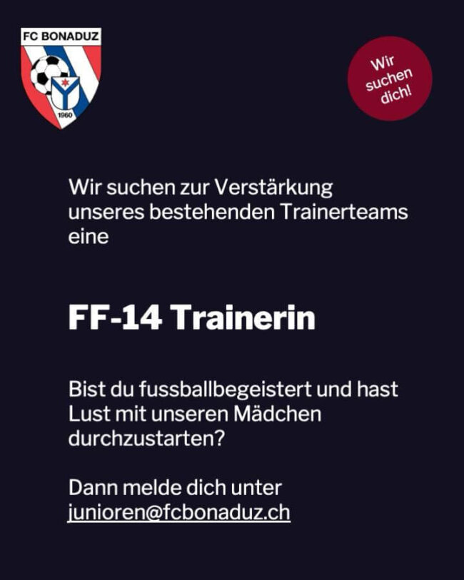 Wir suchen zur Verstärkung unseres Trainerteams eine engagierte Trainerin für unser FF-14 Team. Wenn du fussballbegeistert bist und Freude daran hast, mit motivierten Mädchen zu arbeiten, bist du bei uns genau richtig. Gleichzeitig freuen wir uns über fussballinteressierte Mädchen der Jahrgänge 2012 bis 2015, die Lust haben, Teil unseres Teams zu werden und gemeinsam Spass…