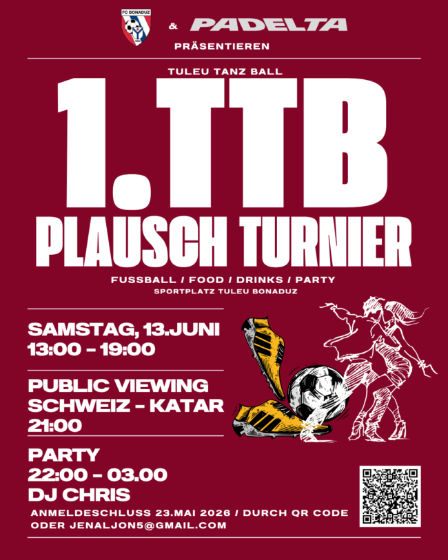 1. TTB Plauschturnier – FC Bonaduz Fussballtalent? Nicht nötig. Teamgeist, gute Laune und Spass? Unbedingt! Der FC Bonaduz lädt euch herzlich zum allerersten TTB – TuleuTanzBall ein. Einem Plauschturnier, bei dem nicht nur gekickt, sondern vor allem gelacht und gefeiert wird. Am 13. Juni 2026 auf dem Sportplatz Tuleu in Bonaduz erwartet euch ein Fussballturnier…