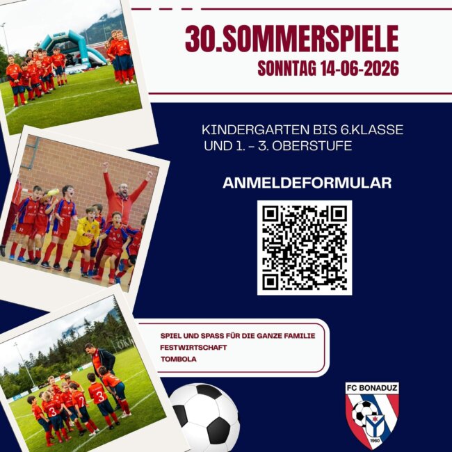 30. Sommerspiele – FC Bonaduz Der FC Bonaduz lädt herzlich zu den 30. Sommerspielen ein. Der Anlass findet am Sonntag, 14. Juni 2026 statt und verspricht einen abwechslungsreichen Tag voller Spiel, Bewegung und Spass für Kinder, Jugendliche und die ganze Familie. Teilnehmen können Kinder vom Kindergarten bis zur 6. Klasse sowie Schülerinnen und Schüler der…