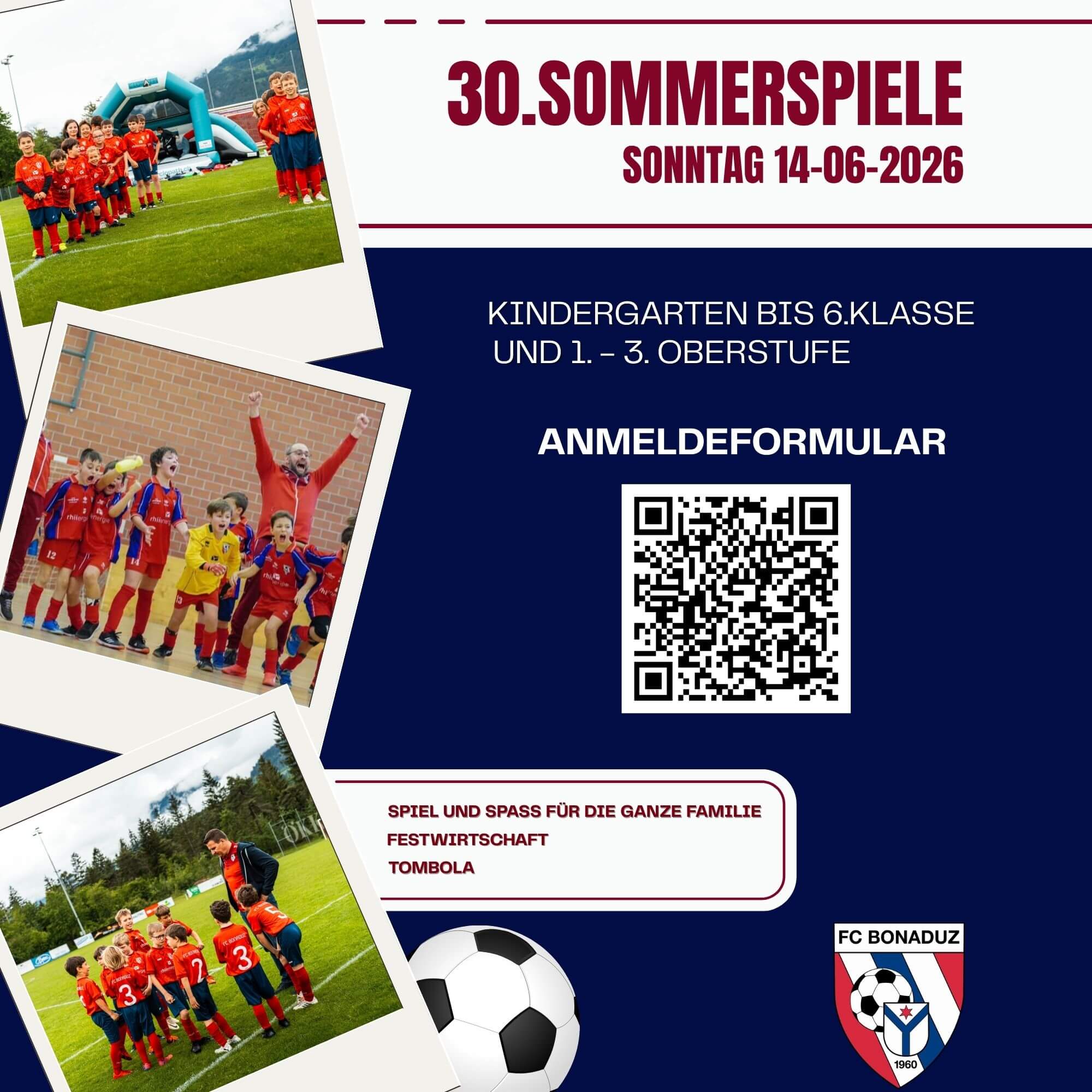 Der FC Bonaduz lädt herzlich zu den 30. Sommerspielen ein. Der Anlass findet am Sonntag, 14. Juni 2026 statt und verspricht einen abwechslungsreichen Tag voller Spiel, Bewegung und Spass für Kinder, Jugendliche und die ganze Familie.