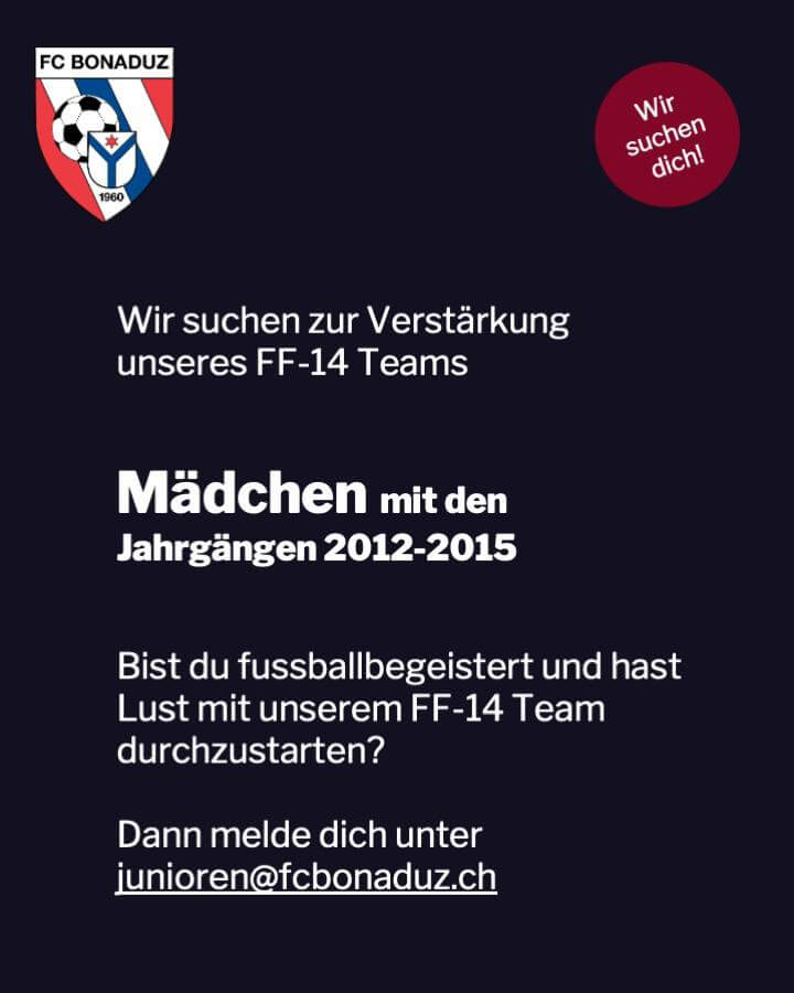 Gleichzeitig freuen wir uns über fussballinteressierte Mädchen der Jahrgänge 2012 bis 2015, die Lust haben, Teil unseres Teams zu werden und gemeinsam Spass am Spiel zu haben. Melde dich bei Interesse gerne unter junioren@fcbonaduz.ch und werde Teil unserer Fussballfamilie.